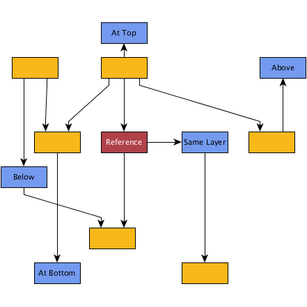 LayerConstraintFactory instance|  A graph laid out with IncrementalHierarchicLayouterwith default settings. The labels indicate the desired placement of certain nodes relative to a reference node. |  After defining appropriate layer constraints and running the layout again, the labeled nodes now have their intended placement. |