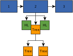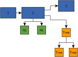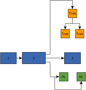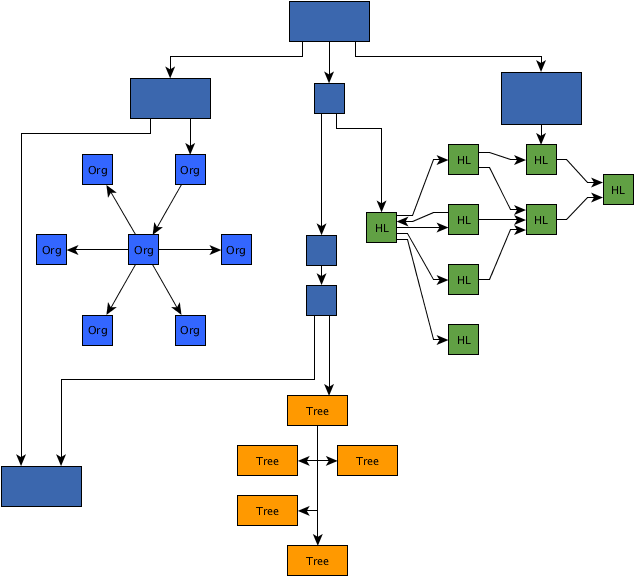 A graph in hierarchic layout with subcomponents in 3 layout styles. Blue: Organic, Green: Hierarchic, Orange: Tree